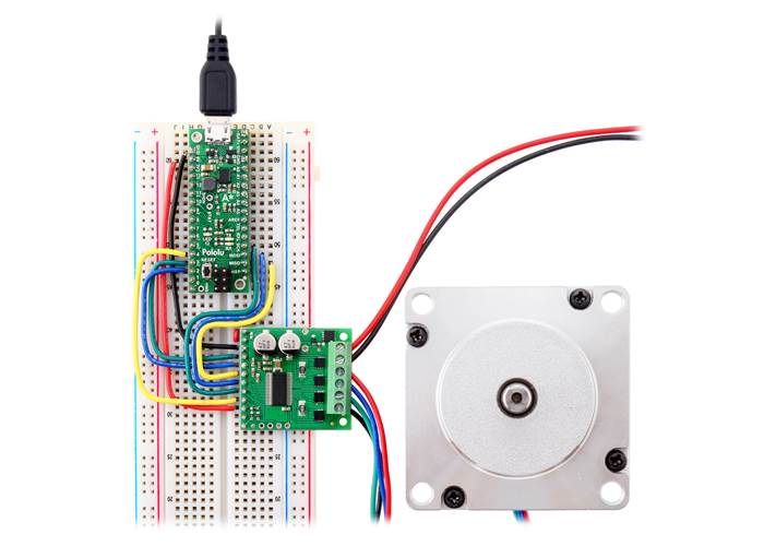 Controlling a Pololu High-Power Stepper Motor Driver with an Arduino-compatible #3104 A-Star 32U4 Mini SV (36v4 version pictured).