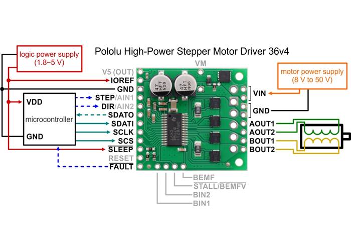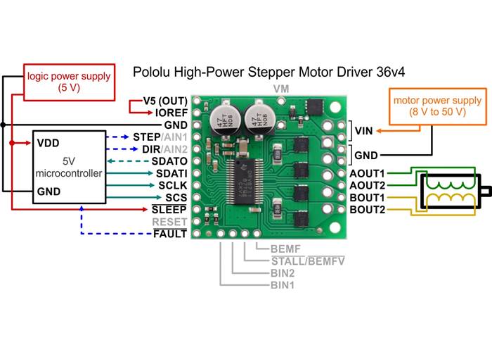 Typical wiring diagram for connecting a microcontroller to a Pololu High-Power Stepper Motor Driver 36v4.