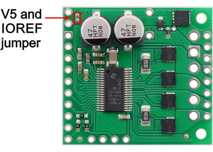 The High-Power Stepper Motor Driver 36v4 has an internal 5 V regulator that can be used to supply IOREF in cases where the board is being used in 5 V systems. We provide a shorting block for connecting V5 to IOREF, or for a more compact connection, you can bridge the surface mount jumper located next to those pins (highlighted in the picture below).