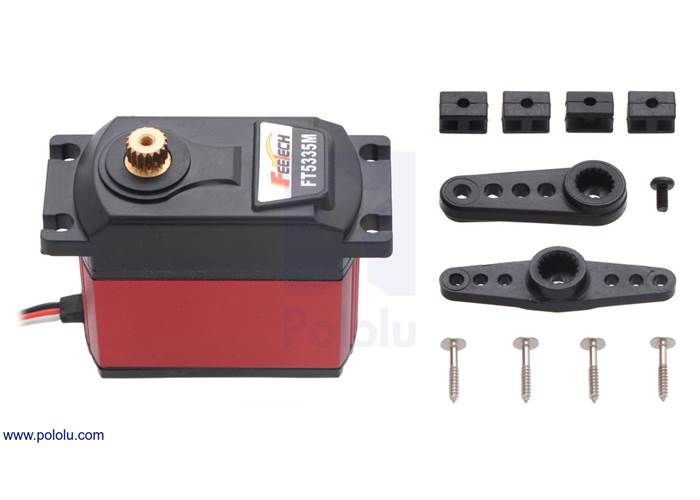 This version of the 1/4-scale FT5335M ultra-high-torque, high-voltage digital giant servo from FEETECH is specially modified to provide access to the feedback potentiometer through a fourth (green) wire, allowing you to directly measure the position of the output. This extra information enables more complex robotics applications, such as determining when the servo has reached its target, detecting when the output is blocked, or implementing your own higher-level closed-loop position control.