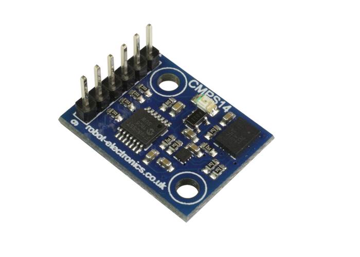 The CMPS14 module is the 5th generation tilt compensated compass from Devantech. Employing a 3-axis magnetometer, 3 axis gyro and a 3-axis accelerometer and a powerful Kalman filter, the CMPS14 has been designed to remove the errors caused by tilting of the PCB.