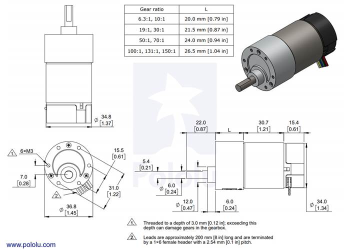 A two-channel Hall effect encoder is used to sense the rotation of a magnetic disk on a rear protrusion of the motor shaft. The quadrature encoder provides a resolution of 64 counts per revolution of the motor shaft when counting both edges of both channels. To compute the counts per revolution of the gearbox output, multiply the gear ratio by 64. The motor/encoder has six colour-coded, 8″ (20 cm) leads terminated by a 1×6 female header with a 0.1″ pitch, as shown in the main product picture. This header works with standard 0.1″ male headers and our male jumper and precrimped wires. If this header is not convenient for your application, you can pull the crimped wires out of the header or cut the header off. The following table describes the wire functions: