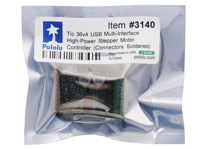 The Tic 36v4 USB Multi-Interface High-Power Stepper Motor Controller makes basic control of a stepper motor easy, with quick configuration over USB using our free software.