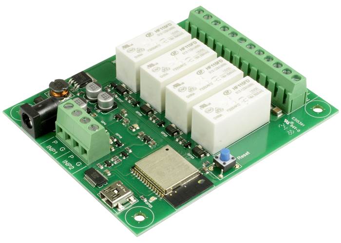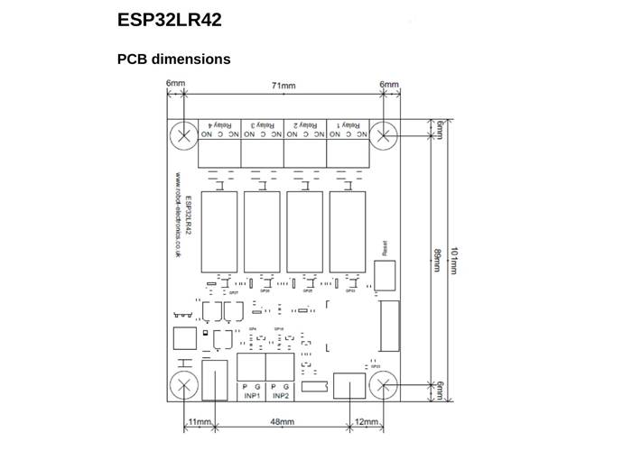 The ESP32LR42 is a programmable WIFI connected relay module using the popular ESP32 and can be programmed like an Arduino. It provides 4 relays capable switching up to 16Amps and 2 digital inputs with pull-ups than can interface directly with volt free contacts. A built in web page allows the relays to be controlled from any web browser.
