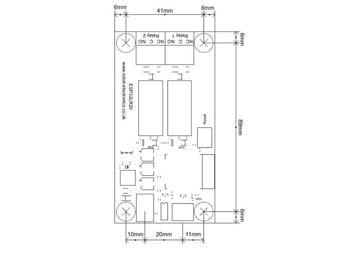 The ESP32LR20 is a WIFI connected relay module using the popular ESP32 and can be programmed like an Arduino. It provides 2 relays capable switching up to 16Amps. The normally open relay contacts have snubbers fitted across