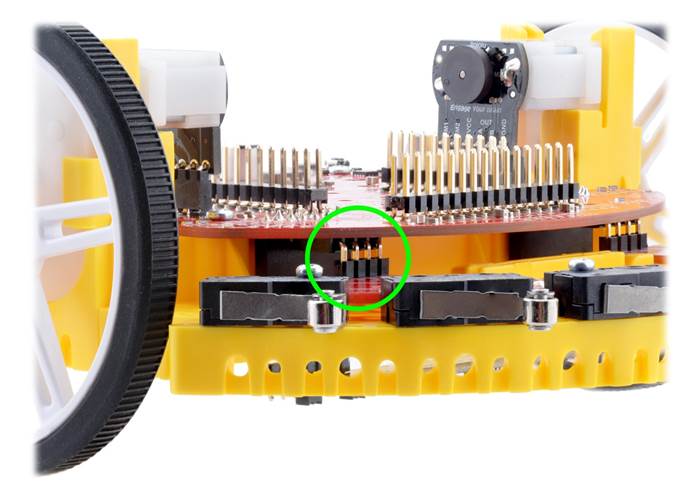 Close-up view of Bumper Switch Assembly male header pins plugged into the female header on the Chassis Board.