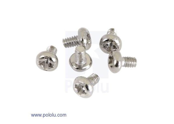 These M1.6, pan-head screws are 3 mm long. They are made from zinc-plated steel and ship in packs of 6. These screws, which can be difficult to find in the US, work with the mounting holes on the brass face plates of our micro metal gearmotors .