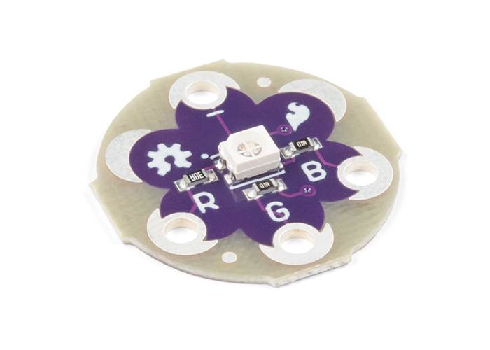 Blink any colour you need! Use the LilyPad RGB LED board as a simple indicator, or by pulsing the red, green, and blue channels, you can produce a broad variety of colors. Each of the colors in the RGB LED are connected to one of the sew tabs on the board labelled R, G, and B.