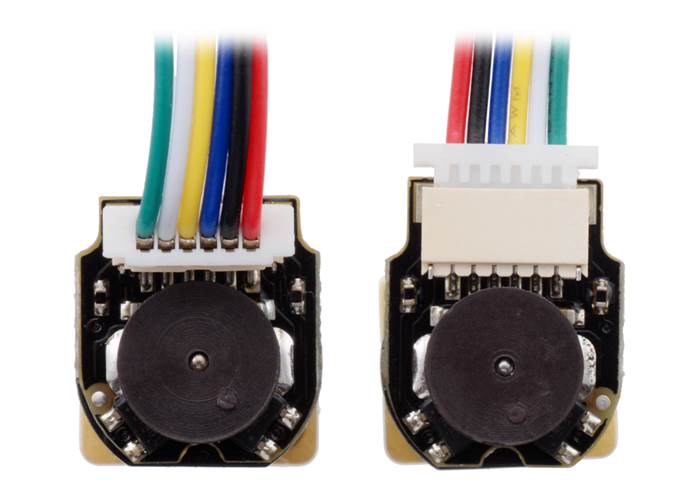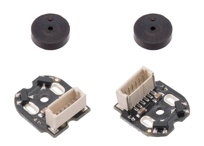 Add quadrature encoders to your micro metal gearmotors (extended back shaft version required) with this kit that uses a magnetic disc and Hall effect sensors to provide 12 counts per revolution of the motor shaft. The sensors operate from 2.7 V to 18 V and provide digital outputs that can be connected directly to a microcontroller or other digital circuit. These encoders have a top-entry, 6-pin male JST SH-type connector, and we have compatible cables available in a variety of lengths.