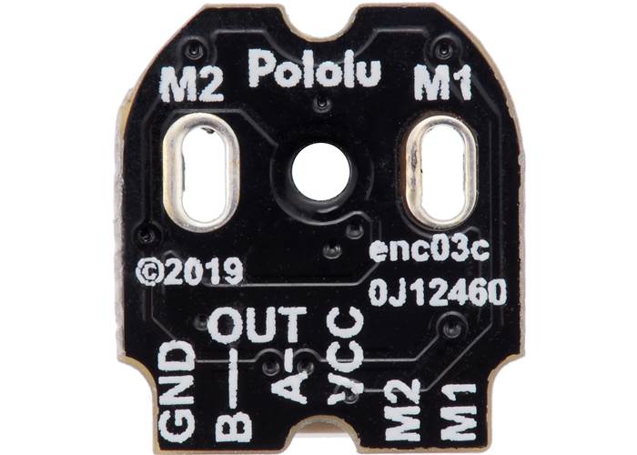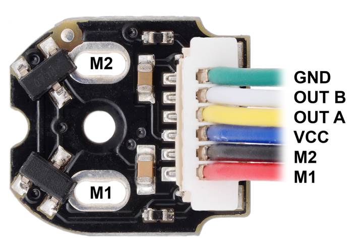The encoder board is designed to be soldered directly to the back of the motor, with the back shaft of the motor protruding through the hole in the middle of the circuit board. One way to achieve good alignment between the board and the motor is to tack down the board to one motor pin and to solder the other pin only when the board is flat and well aligned. Be careful to avoid prolonged heating of the motor pins, which could deform the plastic end cap of the motor or the motor brushes. Once the board is soldered down to the two terminals, the motor leads are connected to the M1 and M2 connector pins as labelled below, and they can be accessed via the red and black wires when used with our corresponding JST cables. The remaining four connector pins are used to power the sensors and access the two quadrature outputs: