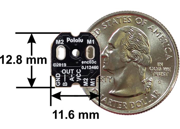 This kit includes two dual-channel Hall effect sensor boards and two 6-pole magnetic discs that can be used to add quadrature encoding to two micro metal gearmotors with extended back shafts (motors and cables are not included with this kit). The encoder board senses the rotation of the magnetic disc and provides a resolution of 12 counts per revolution of the motor shaft when counting both edges of both channels. To compute the counts per revolution of the gearbox output shaft, multiply the gear ratio by 12. This compact encoder solution fits within the 12 mm × 10 mm cross section of the motors on three of the four sides, and it extends 2.8 mm past the edge of the quarter side.