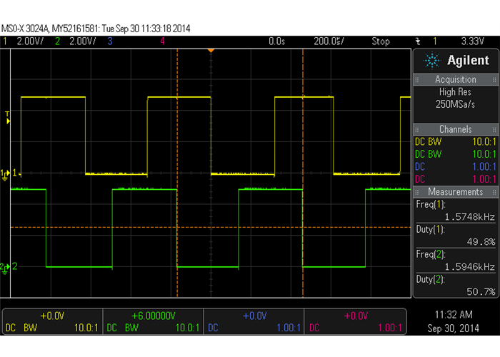 A and B outputs of the magnetic encoder on a high-power (HP) 6V Micro Metal Gearmotor running at 6 V. |