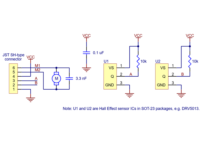 The sensors are powered through the VCC (blue wire) and GND (green wire) pins. VCC can be 2.7 V to 18 V, and the quadrature outputs A and B (yellow and white wires) are digital signals that are either driven low (0 V) by the sensors or pulled to VCC through 10 kΩ pull-up resistors, depending on the applied magnetic field. The sensors’ comparators have built-in hysteresis, which prevents spurious signals in cases where the motor stops near a transition point.