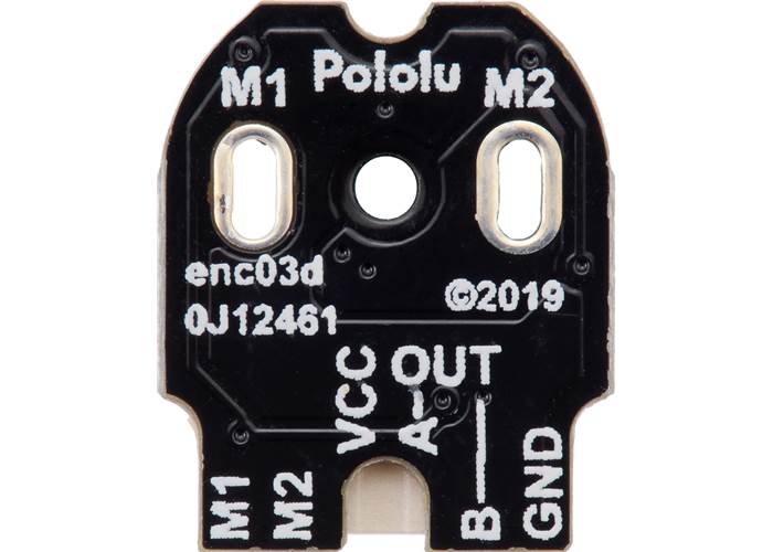 The encoder board is designed to be soldered directly to the back of the motor, with the back shaft of the motor protruding through the hole in the middle of the circuit board. One way to achieve good alignment between the board and the motor is to tack down the board to one motor pin and to solder the other pin only when the board is flat and well aligned. Be careful to avoid prolonged heating of the motor pins, which could deform the plastic end cap of the motor or the motor brushes. Once the board is soldered down to the two terminals, the motor leads are connected to the M1 and M2 connector pins as labelled below, and they can be accessed via the red and black wires when used with our corresponding JST cables. The remaining four connector pins are used to power the sensors and access the two quadrature outputs: