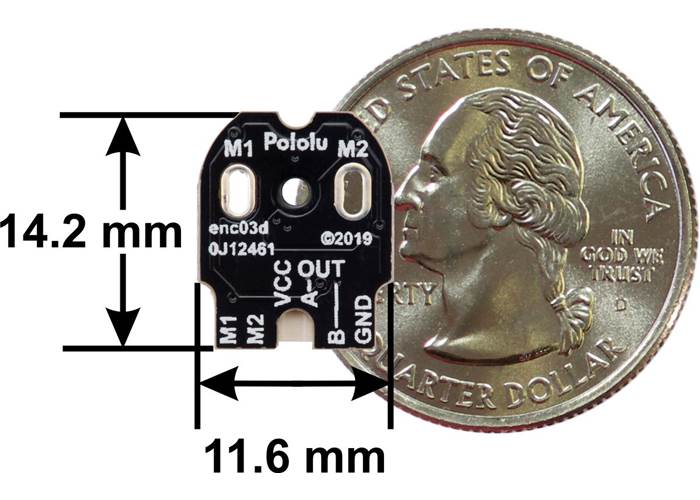 This kit includes two dual-channel Hall effect sensor boards and two 6-pole magnetic discs that can be used to add quadrature encoding to two micro metal gearmotors with extended back shafts (motors and cables are not included with this kit). The encoder board senses the rotation of the magnetic disc and provides a resolution of 12 counts per revolution of the motor shaft when counting both edges of both channels. To compute the counts per revolution of the gearbox output shaft, multiply the gear ratio by 12. This compact encoder solution fits within the 12 mm × 10 mm cross section of the motors on three of the four sides, and it extends 4.2 mm past the edge of the quarter side.