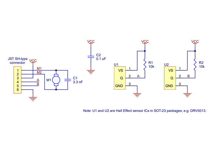 The sensors are powered through the VCC (blue wire) and GND (green wire) pins. VCC can be 2.7 V to 18 V, and the quadrature outputs A and B (yellow and white wires) are digital signals that are either driven low (0 V) by the sensors or pulled to VCC through 10 kΩ pull-up resistors, depending on the applied magnetic field. The sensors’ comparators have built-in hysteresis, which prevents spurious signals in cases where the motor stops near a transition point.