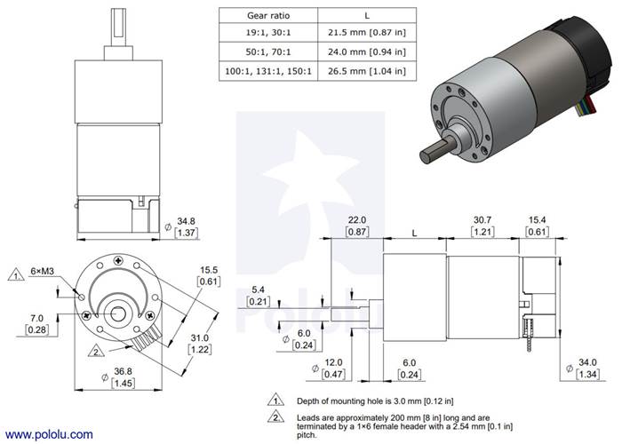 A two-channel Hall effect encoder is used to sense the rotation of a magnetic disk on a rear protrusion of the motor shaft. The quadrature encoder provides a resolution of 64 counts per revolution of the motor shaft when counting both edges of both channels. To compute the counts per revolution of the gearbox output, multiply the gear ratio by 64. The motor/encoder has six colour-coded, 8″ (20 cm) leads terminated by a 1×6 female header with a 0.1″ pitch, as shown in the main product picture. This header works with standard 0.1″ male headers and our male jumper and precrimped wires. If this header is not convenient for your application, you can pull the crimped wires out of the header or cut the header off. The following table describes the wire functions: