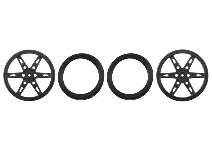 These black plastic wheels have silicone tires and measure 60 mm (2.36″) in diameter. They mount onto micro servo splines with 21 teeth and a 4.8 mm diameter, such as the splines on FEETECH’s FS90R micro continuous rotation servos and FT90R digital micro continuous rotation servos. This product is a pair of wheels.