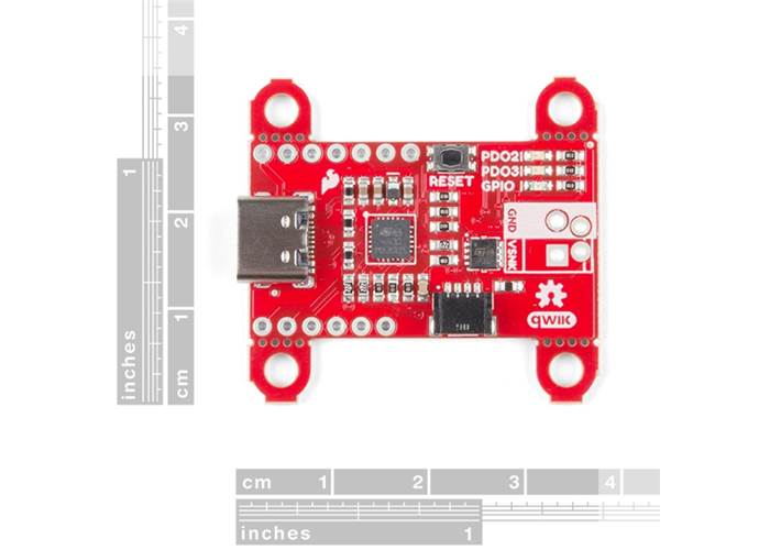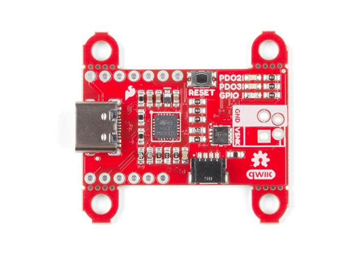 To configure the board, you will need an I2C bus. The Qwiic system makes it easy to connect the Power Delivery board to a microcontroller. Depending on your application, you can also connect to the I2C bus via the plated through holes for SDA and SCL.