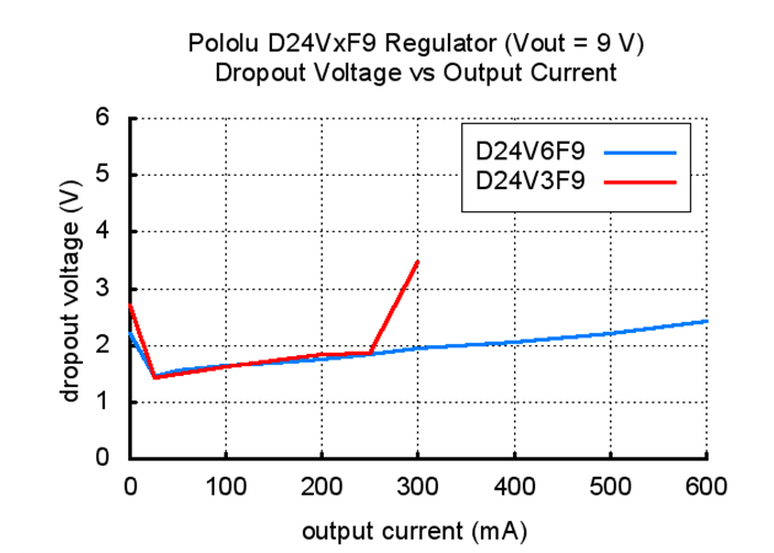 As you can see from the last two graphs, the dropout voltage of the low-current 9 V and 12 V versions (D24V3F9 and D24V3F12) spikes as the output current nears the 300 mA limit. For similar regulators with much lower dropout voltages, please consider our newer 500 mA D24V5Fx buck regulators.