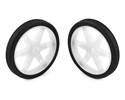 These plastic wheels with silicone tires are 8 mm (0.3″) wide and 60 mm (2.36″) in diameter and are designed for use with micro servos with 4.8 mm diameter splines with 21 teeth, such as FEETECH’s FS90R micro continuous rotation servos and FT90R digital micro continuous rotation servos. The combination can serve as a small, inexpensive, and easy-to-control drive system for a miniature robot. The wheel presses onto the servo spline just like a typical servo horn, and the small screw included with the servo accessory pack for mounting servo horns should be used to hold the wheel in place.