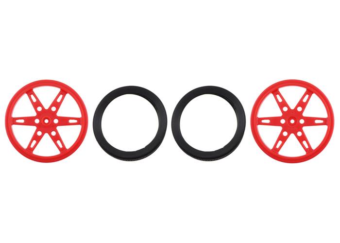 These red plastic wheels have silicone tires and measure 60 mm (2.36″) in diameter. They mount onto micro servo splines with 21 teeth and a 4.8 mm diameter , such as the splines on FEETECH’s FS90R micro continuous rotation servos and FT90R digital micro continuous rotation servos .