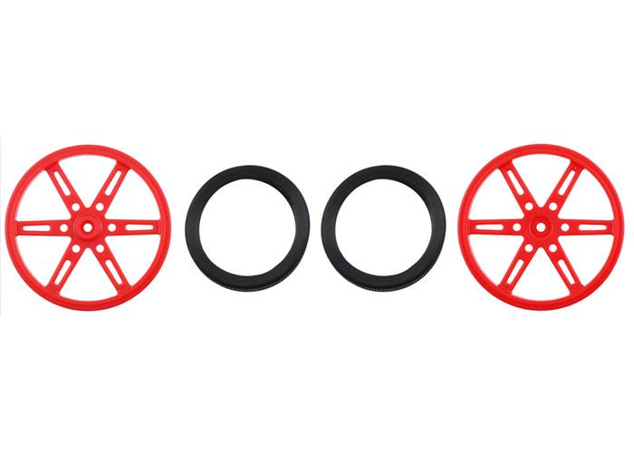 These red plastic wheels have silicone tires and measure 70 mm (2.75″) in diameter. They mount onto standard servo splines with 25 teeth and a 5.8 mm diameter , such as the splines on FEETECH’s FS5106R , Power HD’s AR-3606HB , and SpringRC’s SM-S4303R continuous rotation servos.