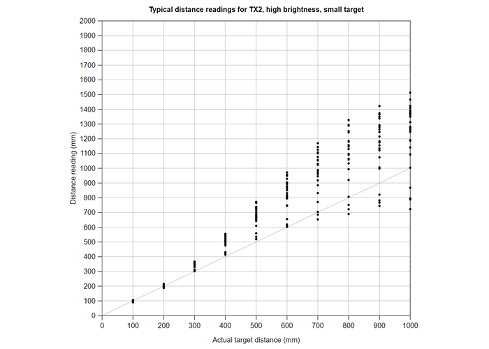 Typical distance reading accuracy of TX2 on the 3-Channel Wide FOV Time-of-Flight Distance Sensor Using OPT3101.