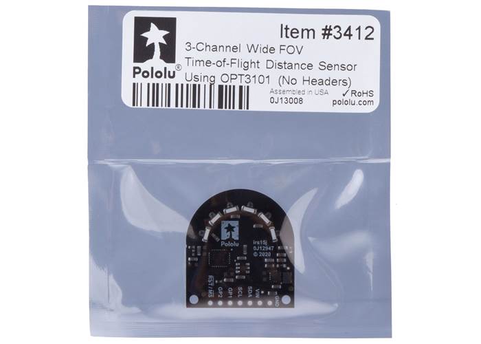 This board is a 3-channel time-of-flight proximity and distance sensor module based on the OPT3101 IC from Texas Instruments. It emits infrared light in one of three selectable directions with its six integrated LEDs and measures distance by measuring the time delay of the reflected signal. Distance measurements can be read through a digital I²C interface. The combined field of view of the three sensing zones is almost 180 degrees, and the maximum range is about one meter. This module does not include any headers; we carry an alternate version with headers soldered.