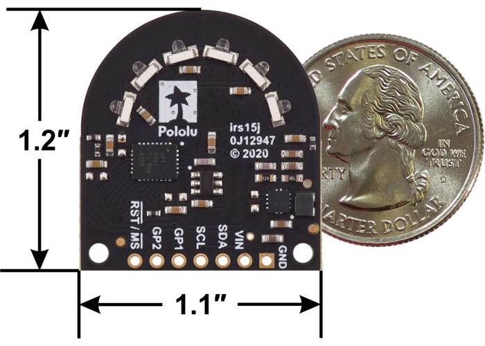 This board has three channels that each cover approximately 50° to 60°, giving the sensor a wide field of view (FOV). In favorable conditions, the sensor can measure objects at distances up to 1 m. Distance measurements are available through the sensor’s I²C interface, which is also used to configure the sensor.