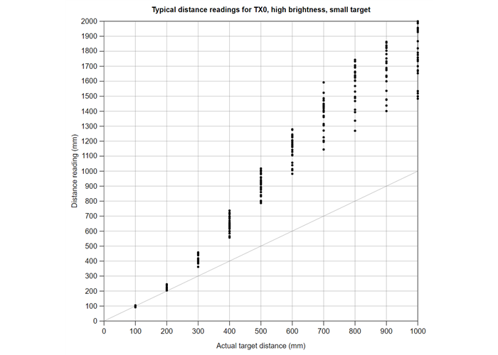 Typical distance reading accuracy of TX0 on the 3-Channel Wide FOV Time-of-Flight Distance Sensor Using OPT3101.