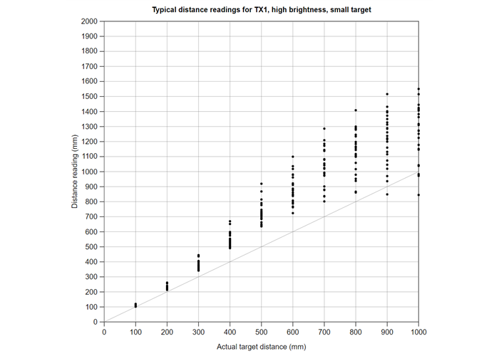 Typical distance reading accuracy of TX1 on the 3-Channel Wide FOV Time-of-Flight Distance Sensor Using OPT3101.