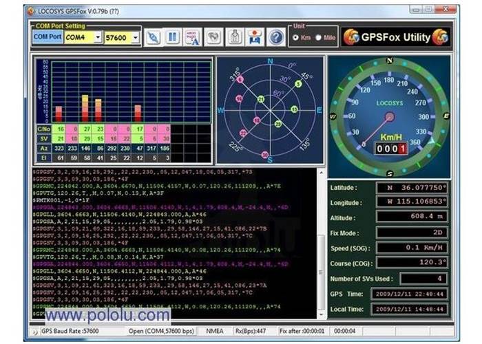The GPSFox (1MB zip) Windows application from LOCOSYS displays the serial GPS data in a fancy format, but, unlike the the Mini GPS application, it can’t configure the LS20031 GPS receiver module.