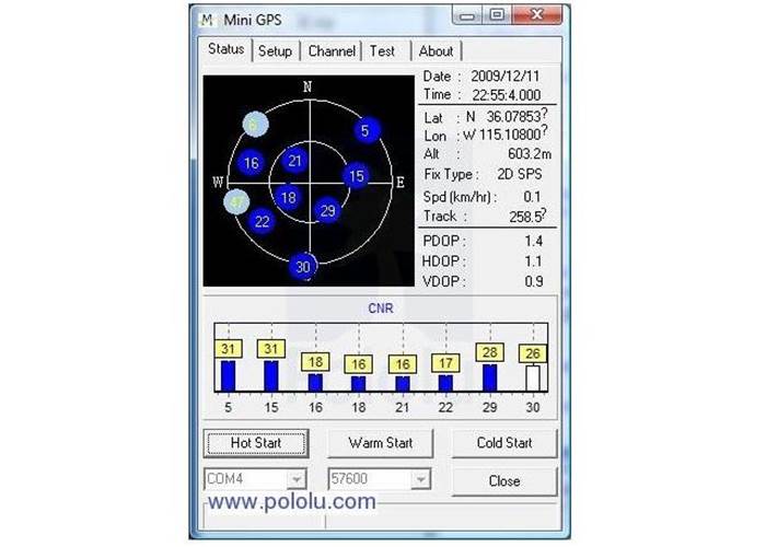 A windows application that interprets NMEA data and displays it nicely. This application looks fancy, but doesn’t let you configure the receiver chip the way the MiniGPS application does.