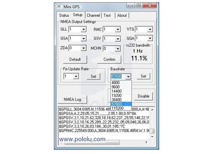 The LS20031 GPS receiver module’s firmware is initially set to a 5Hz update rate, a 57600bps serial communication rate, and is set to output GGA, GLL, GSV, GSA, RMC, and VTG NMEA sentences. After connecting the LS20031 GPS receiver to a computer using a serial port or USB-to-serial adaptor, you can use the Mini GPS Windows application (1MB zip) to change these default settings. You can change the baud rate, or turn off the NMEA sentences you don’t need. The MTK packet user’s manual (79k pdf) provides a list of ASCII packets that you can send to the LS20031 to configure it from within an embedded application.