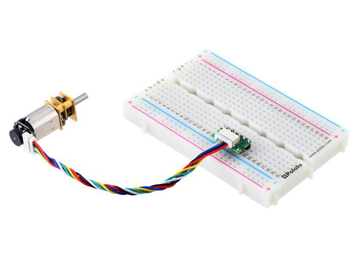 Side-entry JST SH-style connector breakout board in a breadboard, female-female cable, and encoder with connector mounted on a Micro Metal Gearmotor.