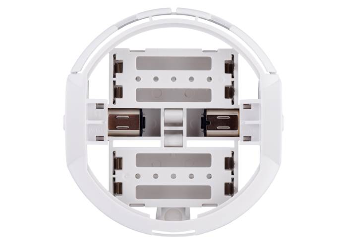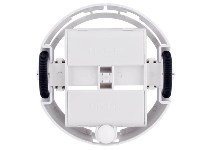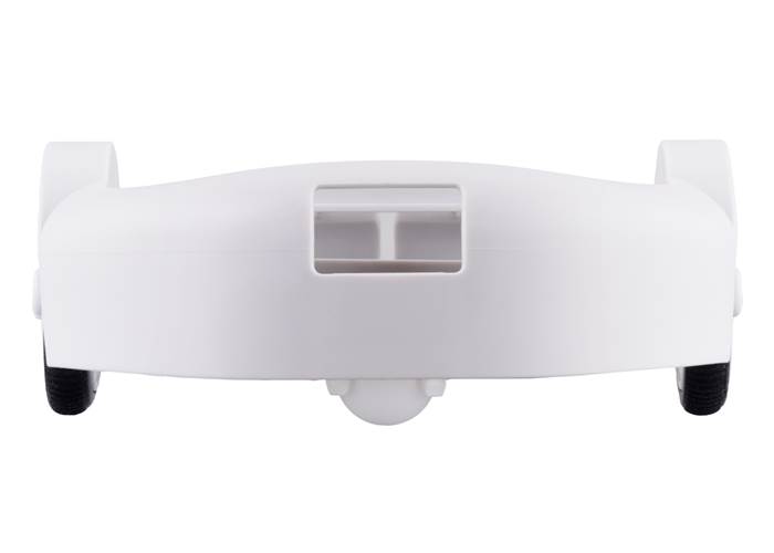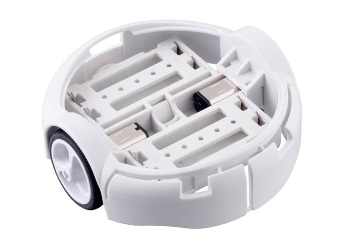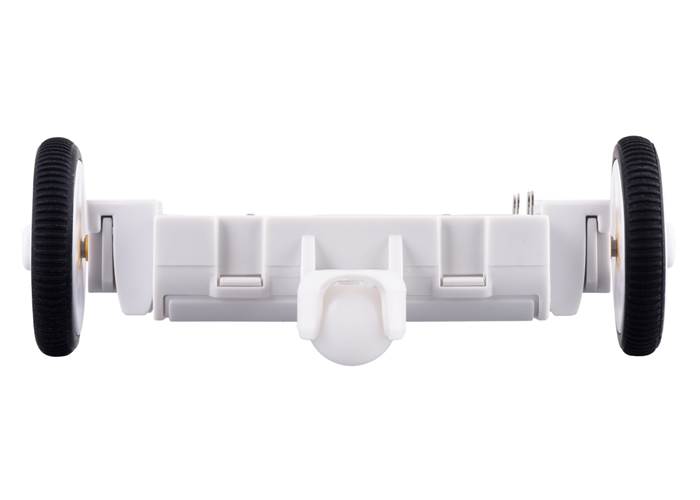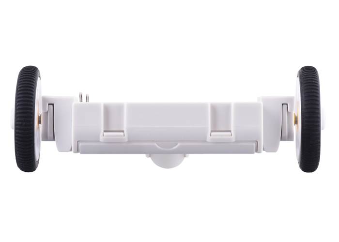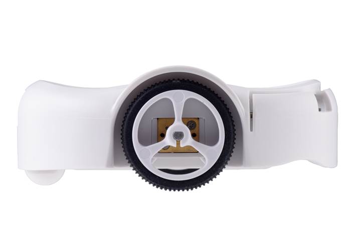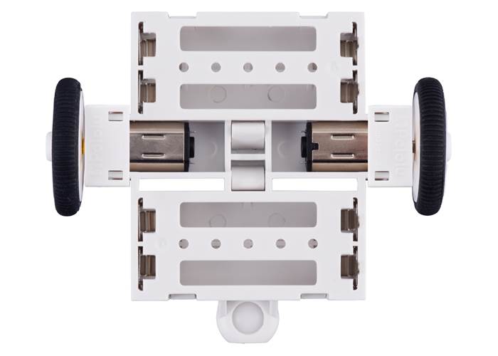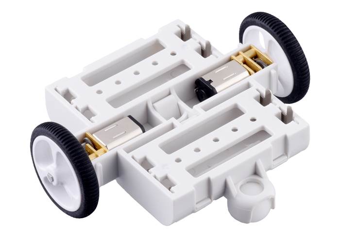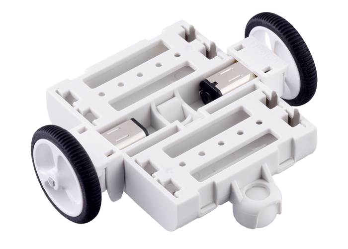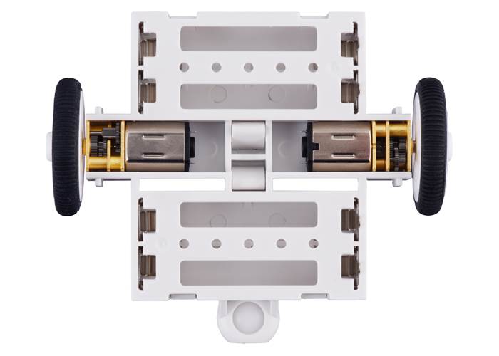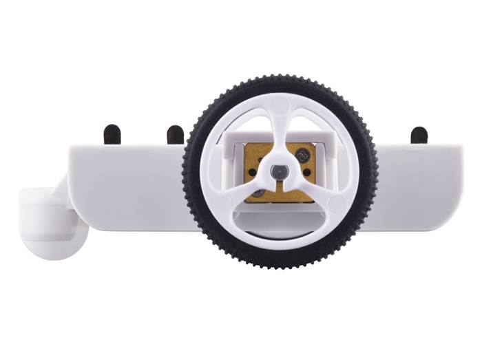 The majority of the chassis is made from white ABS plastic. The 3pi+ chassis has integrated holders designed specifically for Micro Metal Gearmotors, which can then be securely held in place by snapping on the motor clips or the bumper skirt. The included wheels press-fit onto the shafts of the Micro Metal Gearmotors. The 3pi+ chassis also has an integrated rear ball castor socket that the included plastic ball pops into.