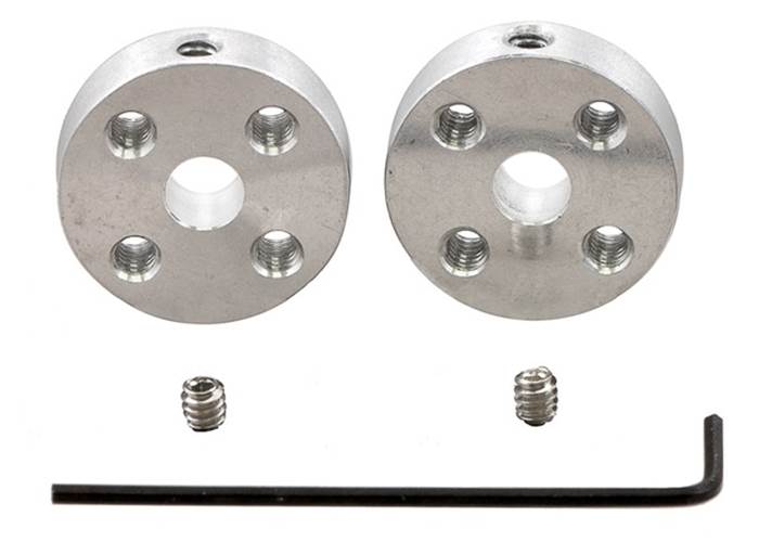 These universal aluminum mounting hubs allow you to mount custom wheels and mechanisms to 5 mm diameter motor shafts. The set includes two hubs, two M3 set screws for securing the hubs to motor shafts, and one 1.5 mm Allen wrench for use with the set screws. Each hub has four threaded mounting holes for M3 screws (not included).