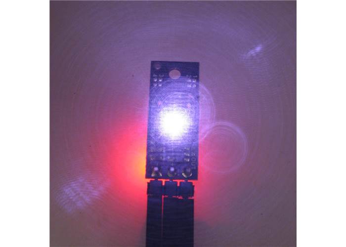 Three connections are necessary to use this module: VIN, GND, and OUT. These pins are accessible through a row of 0.1″-pitch through holes, which work with standard 0.1″ (2.54 mm) male headers and 0.1″ female headers (available separately). The VIN pin should be connected to a 3 V to 5.5 V source, and GND should be connected to 0 volts. The OUT pin drives low (0 V) when an object is being detected and it drives high (to the VIN level) when an object is not being detected. It is weakly pulled high when the sensor is disabled or waiting for its first reading to complete after power-up. A red LED on the back side of the board also lights whenever an object is detected.
