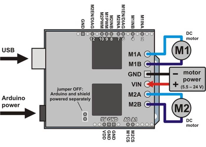 This versatile motor driver is intended for a wide range of users, from beginners who just want a plug-and-play motor control solution for their Arduinos (and are okay with a little soldering) to experts who want to directly interface with ST.’s great motor driver ICs. The Arduino pin mappings can all be customised if the defaults are not convenient, and the VNH5019 control lines are broken out along the left side of the board for general-purpose use without an Arduino (see the right connection diagram below). This versatility, along with an option to power the Arduino directly from the shield, sets this board apart from similar competing motor shields.