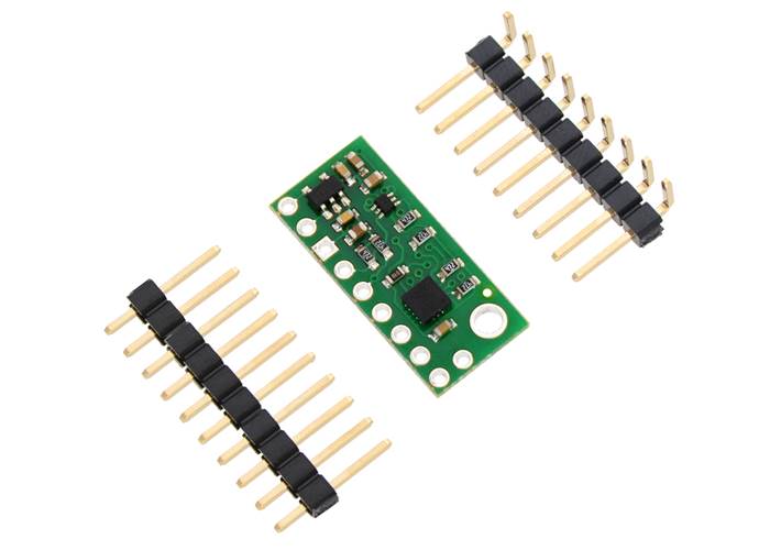 The carrier board includes a low-dropout linear voltage regulator that provides the 3.3 V required by the L3GD20H, which allows the sensor to be powered from 2.5 V to 5.5 V. The regulator output is available on the VDD pin and can supply almost 150 mA to external devices. The breakout board also includes a circuit that shifts the two I²C lines (or SPI clock and data-in lines) to the same logic voltage level as the supplied VIN, making it simple to interface the board with 5 V systems, and the board’s 0.1″ pin spacing makes it easy to use with standard solderless breadboards and 0.1″ perfboards.