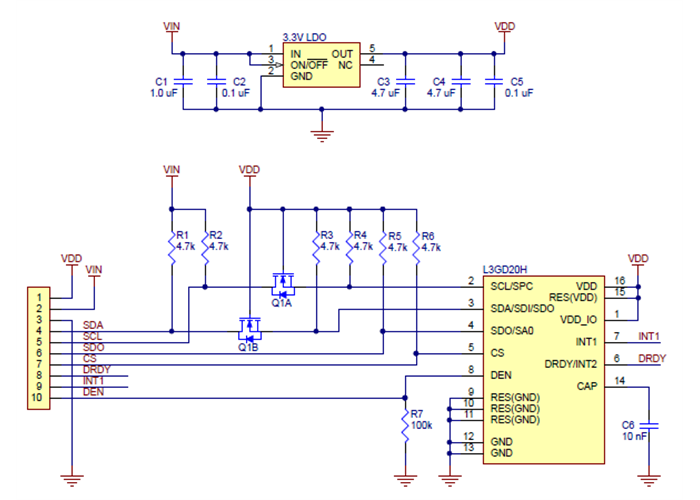 The above schematic shows the additional components the carrier board incorporates to make the L3GD20H easier to use, including the voltage regulator that allows the board to be powered from a 2.5 V to 5.5 V supply and the level-shifter circuit that allows for I²C and SPI communication at the same logic voltage level as VIN. This schematic is also available as a downloadable PDF (174k PDF).
