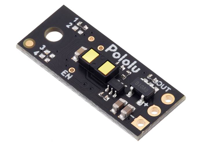 This small lidar-based distance sensor detects the presence of objects within 50 cm (20″). It has a single digital output that drives low when an object is being detected; otherwise, it is high. It works over an input voltage range of 3.0 V to 5.5 V, and the 0.1″ pin spacing makes it easy to use with standard solderless breadboards and 0.1″ perfboards.