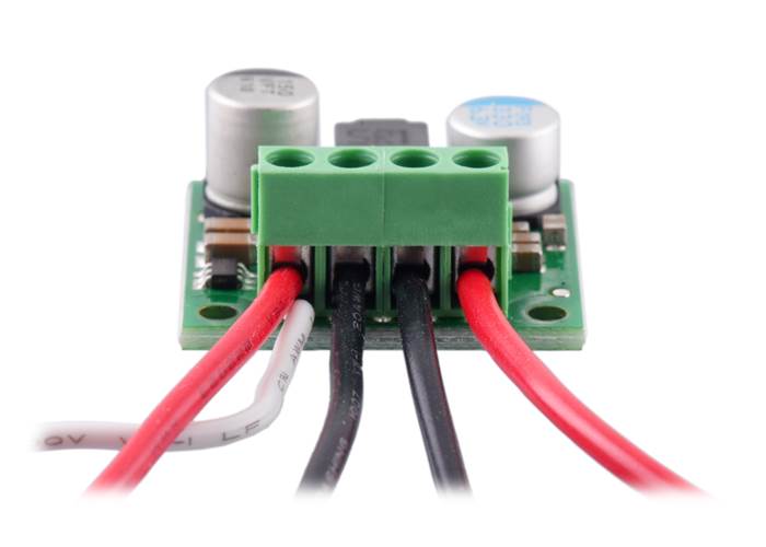 The regulator includes a 5×1 straight male header strip and two 2-pin, 3.5 mm-pitch terminal blocks, and it can be assembled with either the header or terminal blocks, not both. The 0.1″ male header can be soldered into the smaller through-holes. Alternatively, the terminal blocks can be locked together and soldered into the larger holes to allow for convenient temporary connections of unterminated wires (see our short video on terminal block installation). You can also solder wires directly to the board for the most compact installation.