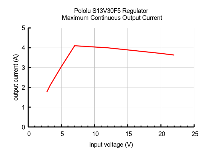 The maximum achievable output current of the regulator varies with the input voltage but also depends on other factors, including the ambient temperature, air flow, and heat sinking. The graph below shows maximum output currents that the regulators in the S13VxF5 family can deliver continuously at room temperature in still air and without additional heat sinking.