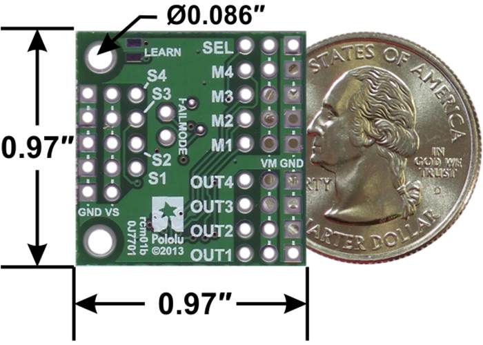 The power supplied by the master RC device should be between 2.5 and 16 V, and it must be capable of supplying the current that the servos connected to the outputs draw. The power pins of the SEL, M1–M4, and OUT1–OUT4 channels are all connected to the same VM rail, and the mux draws its power from those pins. The power pins of the S1–S4 inputs are connected to each other on the VS rail but are not used by the board.