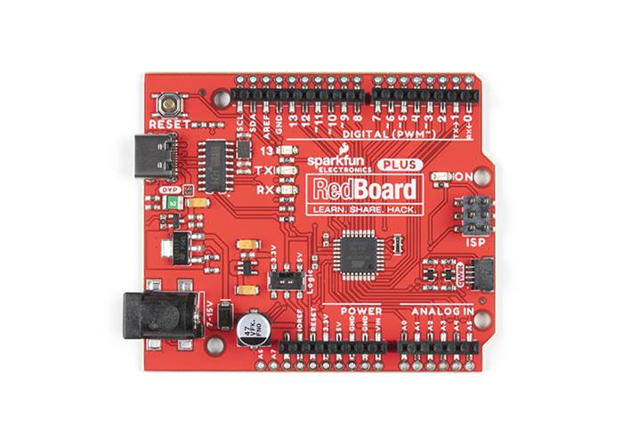 The SparkFun RedBoard Plus can be programmed over a USB-C cable using the Arduino IDE: Just plug in the board, select "Arduino UNO" from the board menu and you're ready to upload code! You can power the SparkFun RedBoard Plus over USB or through the barrel jack. The on-board power regulator can handle anything from 7VDC to 15VDC. Check out the related items below for a compatible wall-wart power supply.