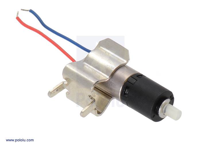 We do not have any brackets for this gearmotor, and it does not have any mounting holes, but its compact size makes it easy to fasten with tape or glue. Alternatively, since this gearmotor is nearly the same size as a 1/4″ fuse, it can be mounted using standard 1/4″ (6 mm) fuse clips, which can be found at places like Digi-Key.