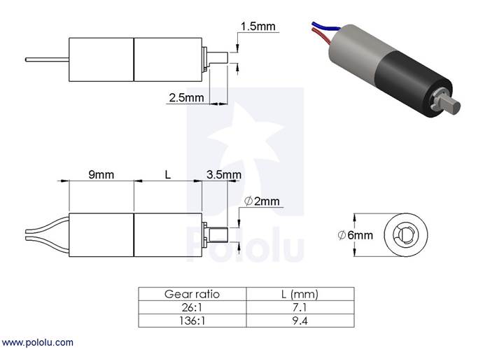 The following diagram shows the micro plastic gearmotor dimensions in mm. The planetary gearbox has a D-shaped plastic output shaft, which is 2 mm in diameter with a section that is flattened by 0.5 mm. The “D” portion of the shaft is 2.5 mm long. The motor measures 6 mm in diameter and 9.3 mm in length, and the gearbox length, labelled “L” in the diagram below, depends on the gear ratio.