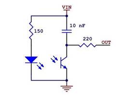 The detector side is a resistor-capacitor (RC) circuit, where the resistance comes from the phototransistor and is a measure of the incident infrared light, and the decay time is proportional to the resistance. The first step of the sensor-reading process—driving the sensor output high—discharges the integrated 10 nF capacitor and puts both sides at the same voltage (VIN). Alternatively, you can think of this as “charging the output node”, and it is functionally equivalent to charging a capacitor with one side connected to ground. Once you are no longer supplying an external voltage to the output pin, the capacitor can slowly charge through the phototransistor, with the rate of charging being a function of the phototransistor’s resistance (which is in turn a function of the incident IR). As the capacitor charges, the voltage on the output side drops, eventually reaching zero when the capacitor is fully charged. Alternatively, you can think of this as “discharging the output node”, and it is functionally equivalent to discharging a capacitor with one side connected to ground.